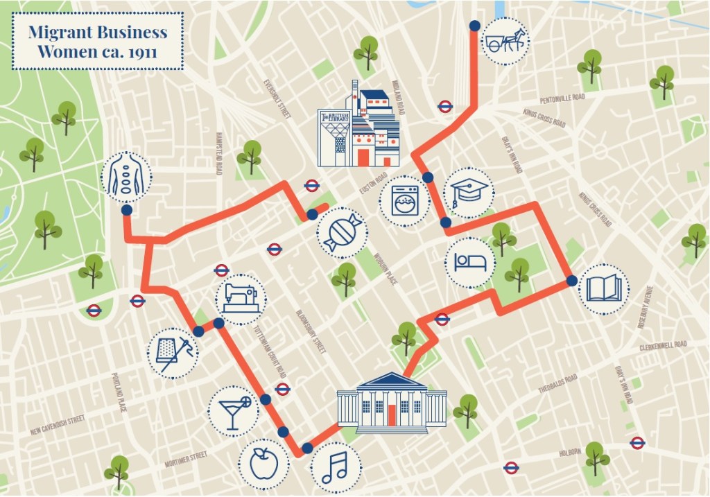 This walk traces the presence of migrant women who ran their own business in 1911. They represent only a small number of the many women born abroad who came to London and contributed to the capital’s economy. The women featured on this walk came from diverse backgrounds and engaged in various businesses of different sizes. We know their presence at these locations, where they were born, and what they did through their records in the 1911 census. This walk tells some of their stories.
